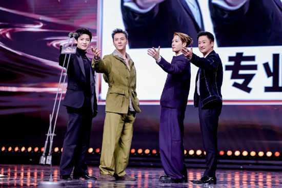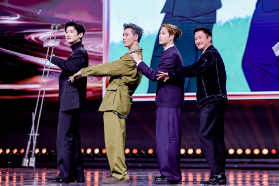当晚的互动环节,主持人临时发起合影挑战,让四人现场还原三组高难度造型,全程无剧本的即兴发挥,直接拉满现场欢乐氛围。第一组复刻吴京经典的“专业团队”姿势,只见吴京摆出双臂展开、掌心向上的标志性动作,白敬亭、陈伟霆、王嘉尔三人一脸严肃紧跟模仿,帅气外形配上一本正经的姿势,却莫名自带喜感,台下观众笑声不断。