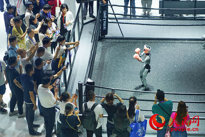 宇树科技人形机器人在全球数字贸易博览会上进行拳击展示。人民网 章勇涛摄