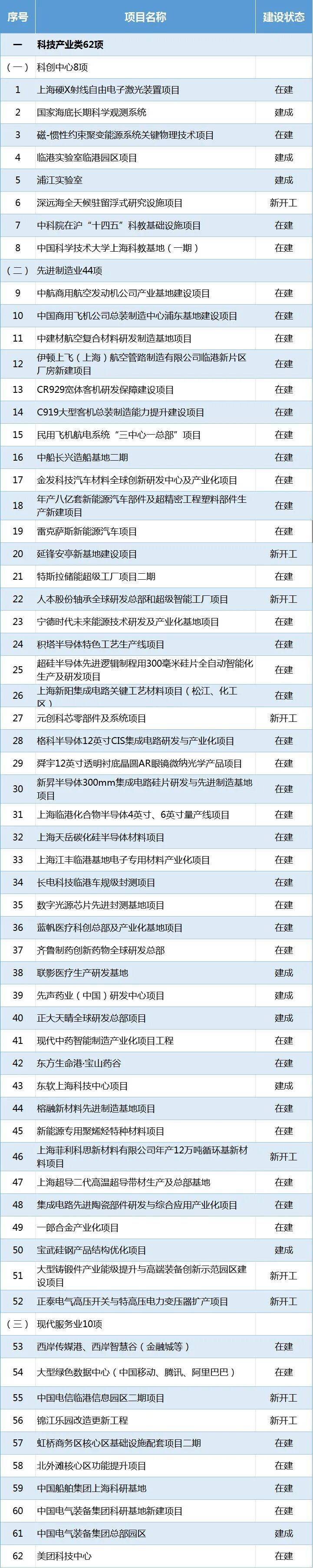 在建项目44项:上海硬X射线自由电子激光装置项目、磁-惯性约束聚变能源系统关键物理技术项目、中航商用航空发动机公司产业基地建设项目、中国商用飞机公司总装制造中心浦东基地建设项目、大型绿色数据中心(中国移动、腾讯、阿里巴巴)等。
